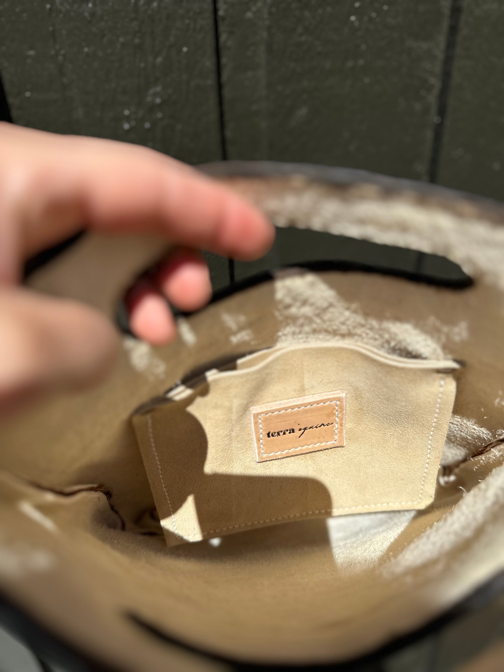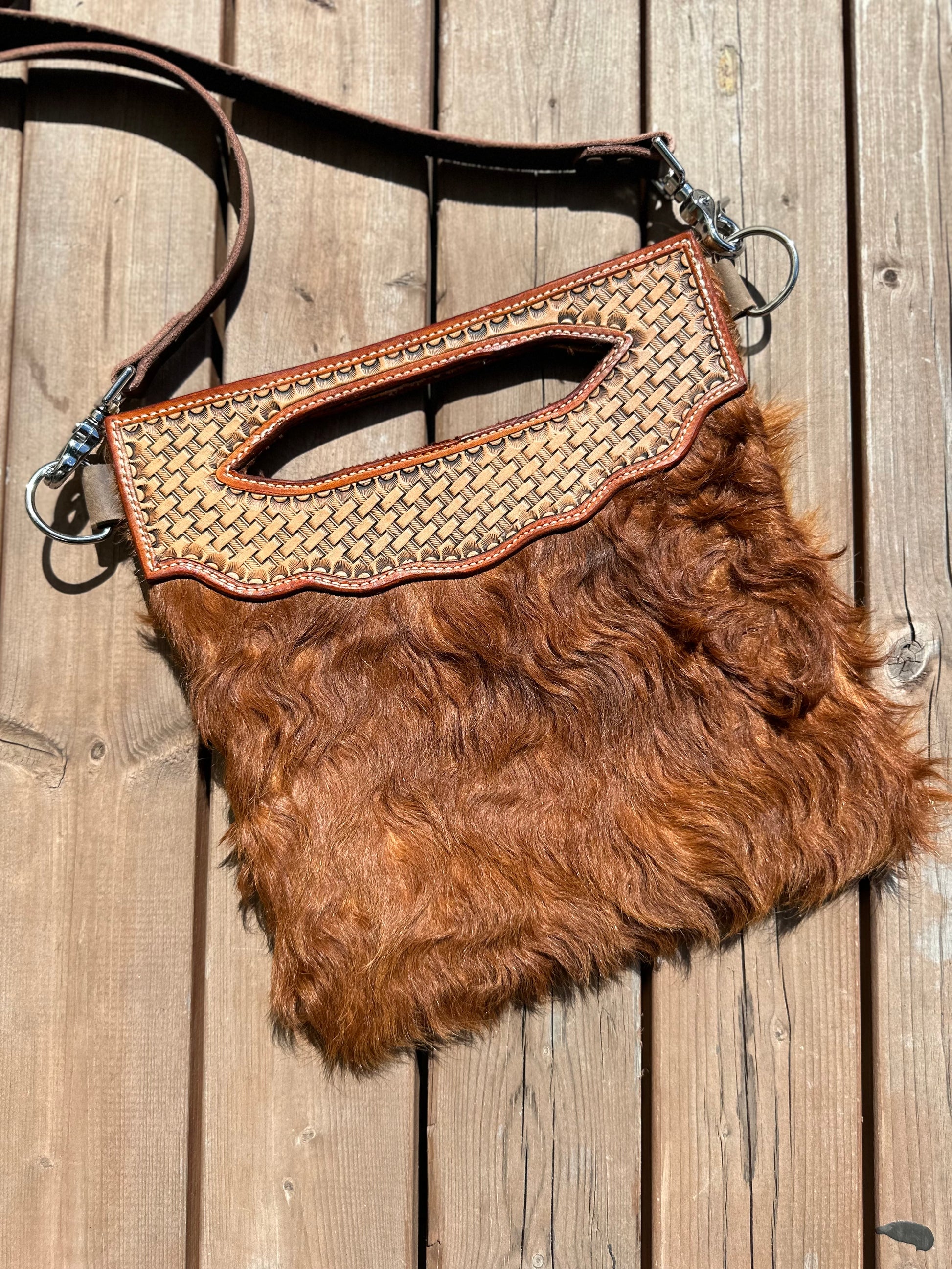 Soft leather, fur on western style crossbody bag. The shoulder strap is adjustable with a decorative buckle on a Latigo leather strap.