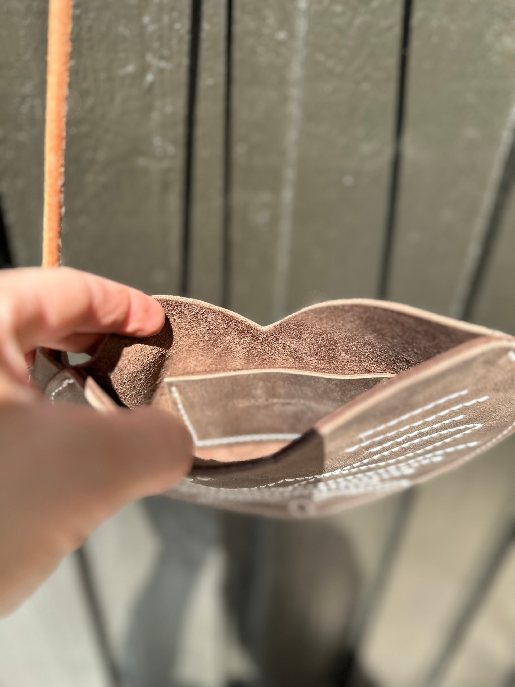 Soft leather bag in a heart shape, with decorative stitching. Shoulder straps are adjustable in length.