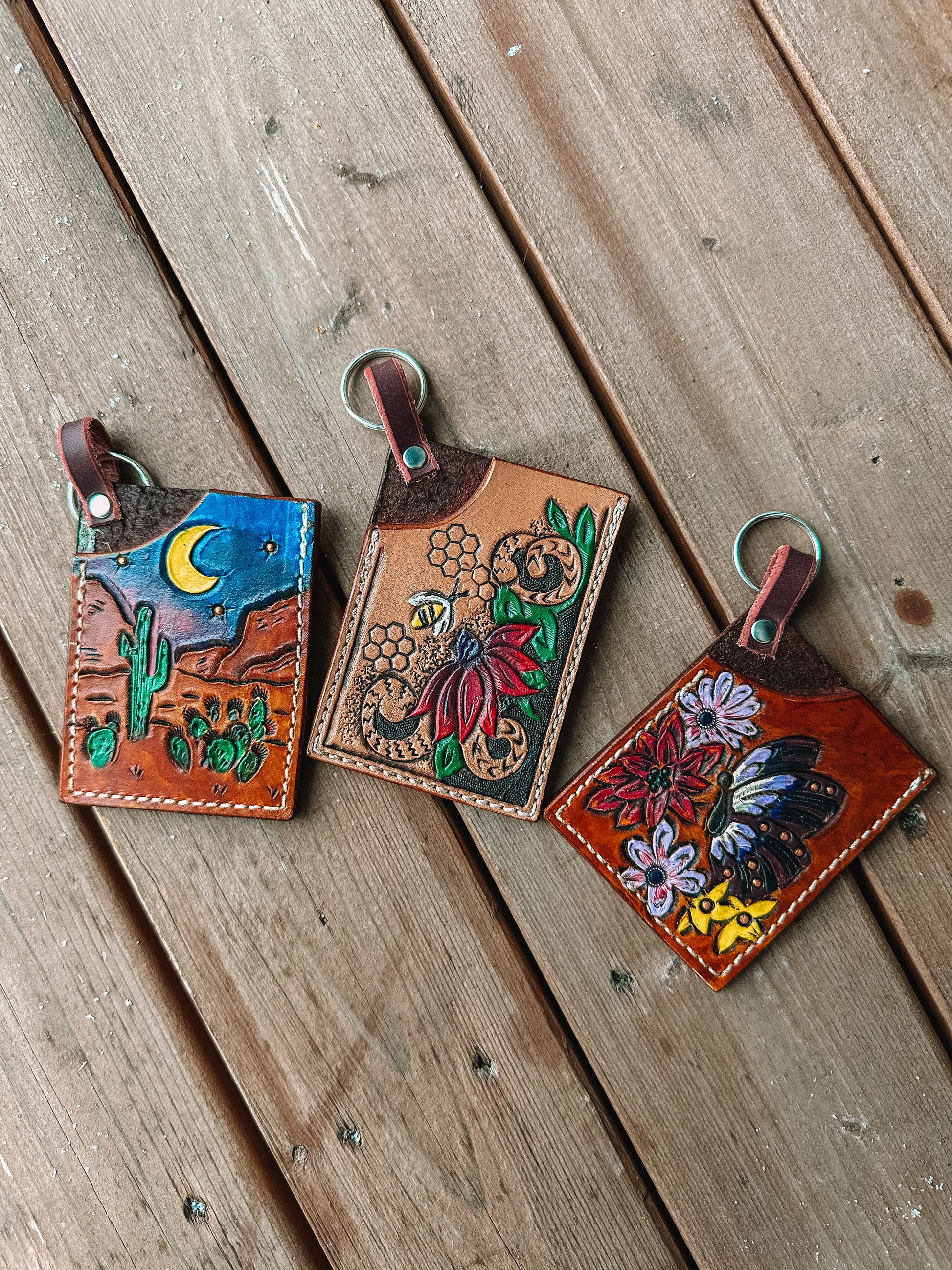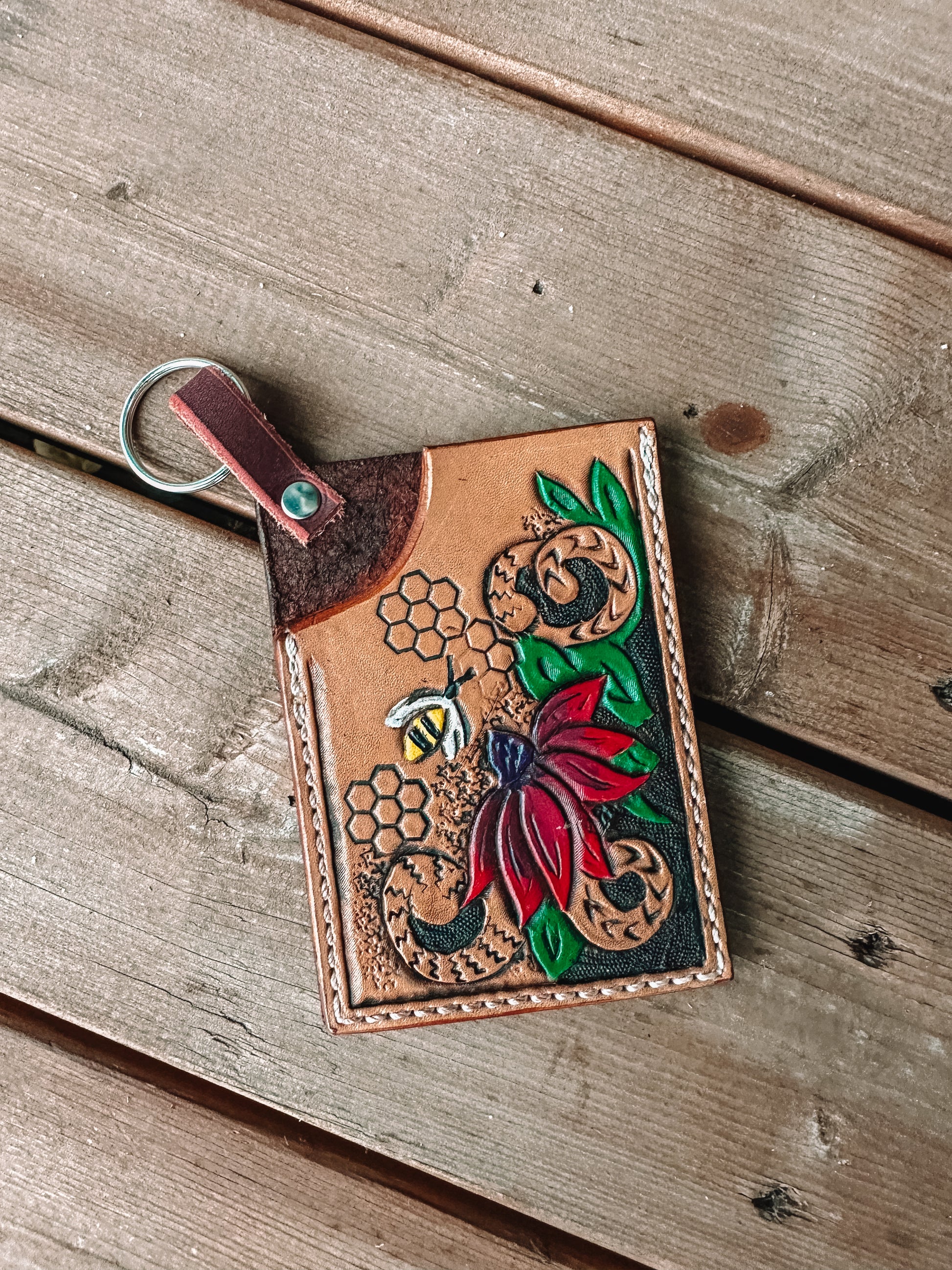Tooled Cardholder with a key ring to attach it to ton your set of keys, bag or whatever you may to attach things to.
