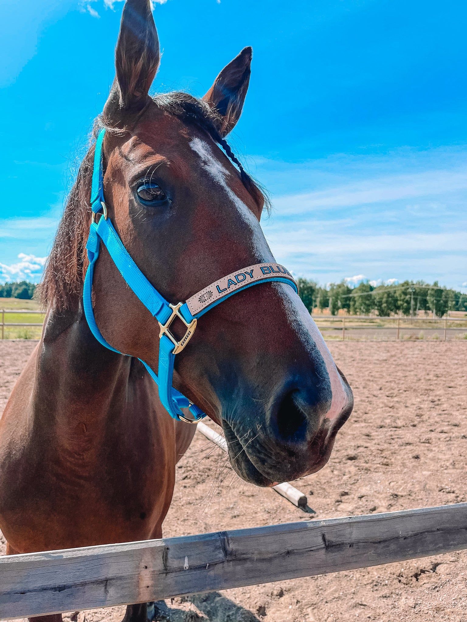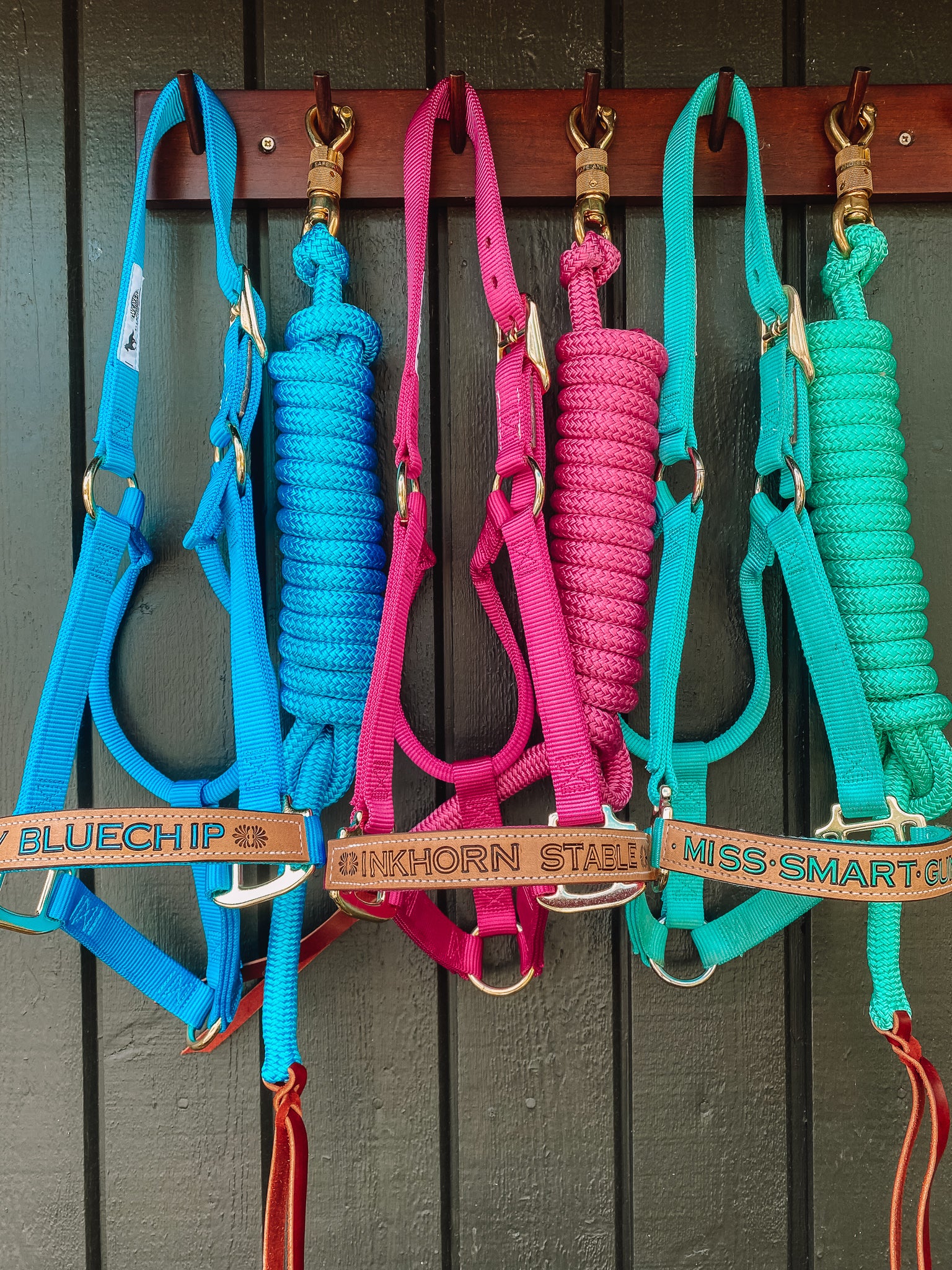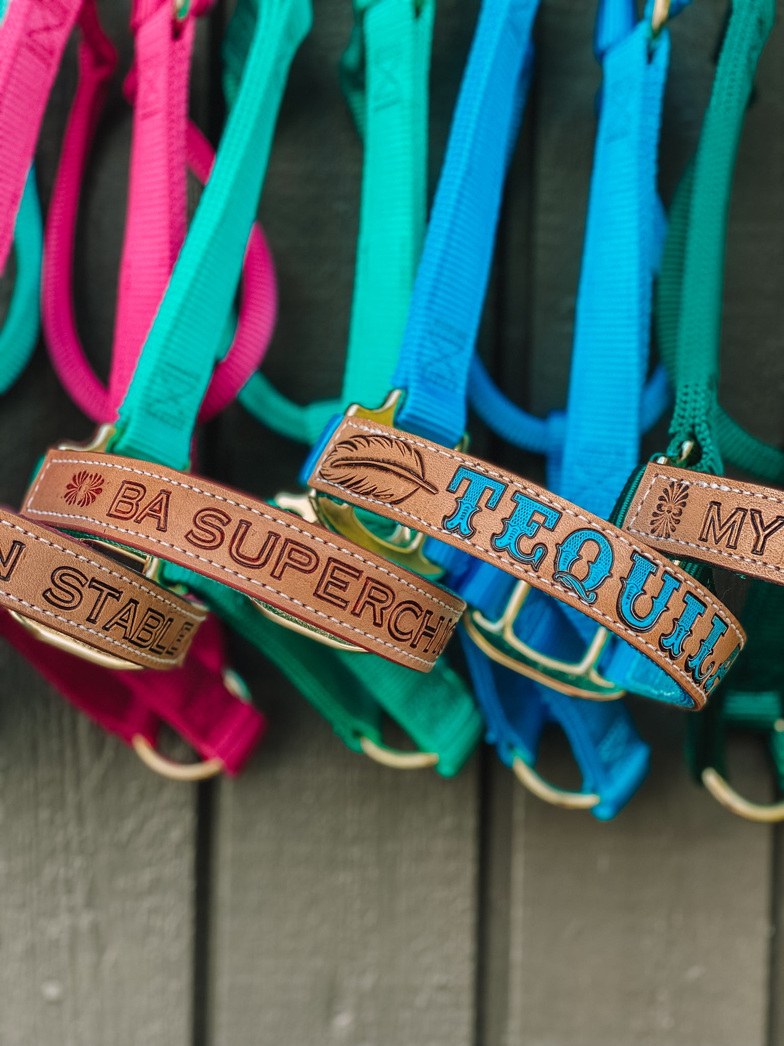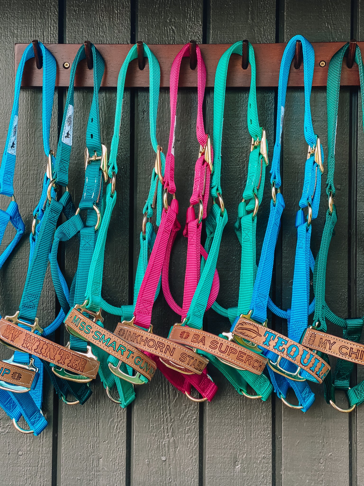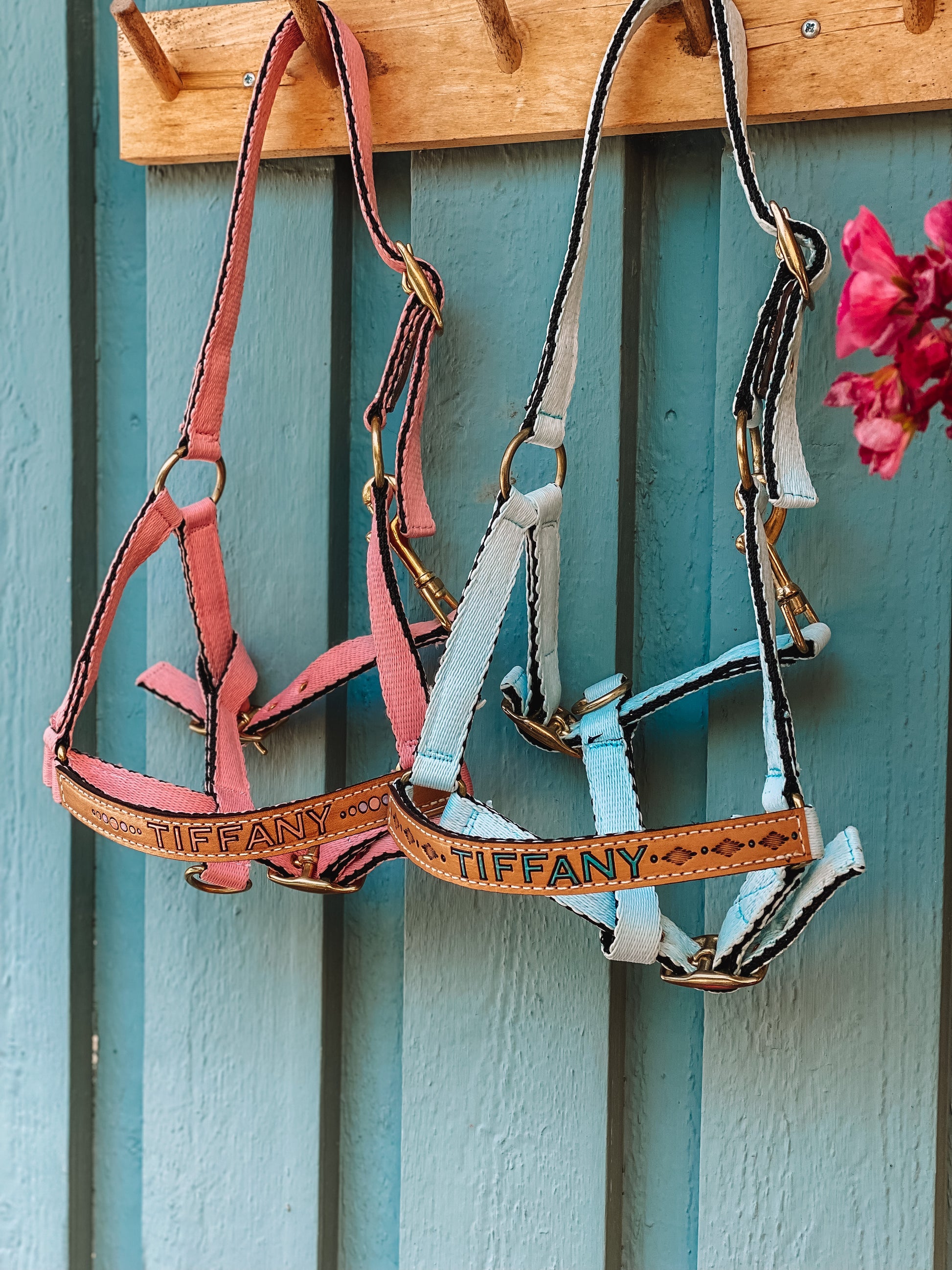 For this product I am using Weaver Nylon halters as base, and have them in stock in sizes Average & Large and various colours such as Black, Lavender, Teal, Hunter Green, Raspberry, Burgundy and Hurricane Blue. You order them additionally to this product if you would like the complete set-up. You choose 'Weaver Halter' in the halter option, select your personalisation style and then click here to find your Weaver Halter.