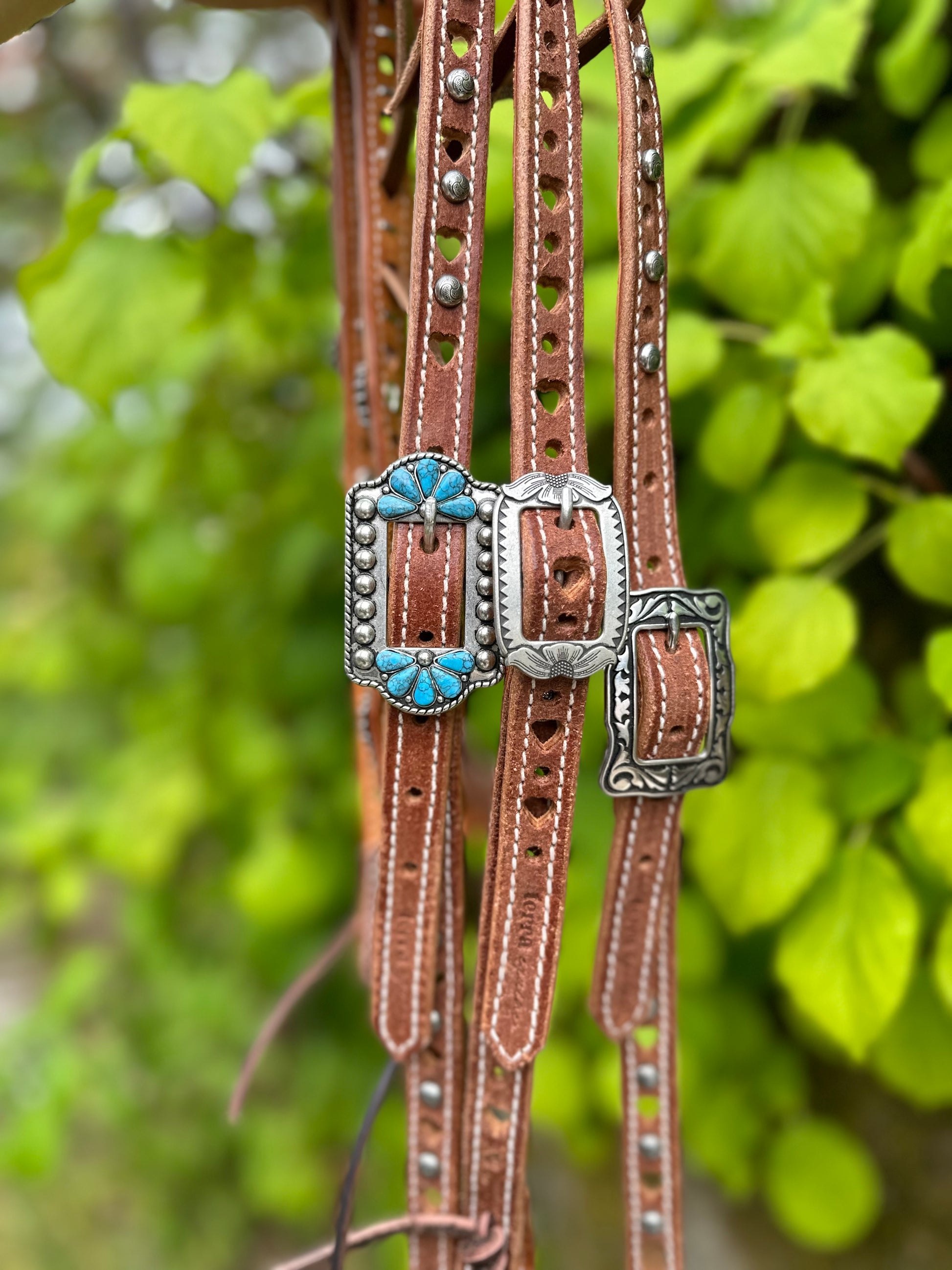 This split ear headstall, featuring three heart conchos on one side and a decorated buckle on the other, is made from Swedish raised & tanned leather in its natural state. This headstall is showing the rough side out.