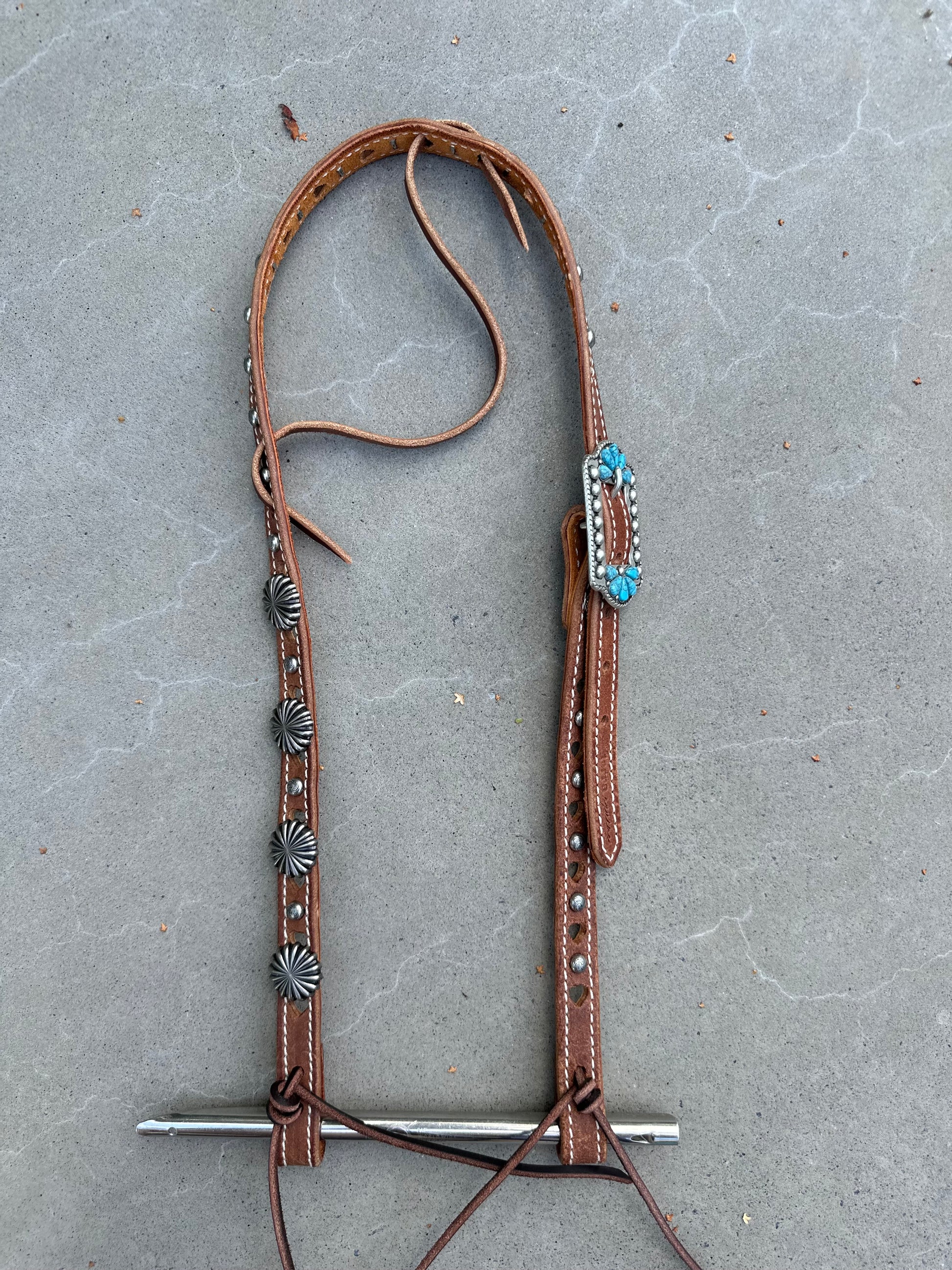 The split ear headstall allows the rider to bridle with ease and adjust the length from one side with the single buckle. If you decide you'd like a different bit on this headstall, simply untie the leather bit ties and switch it out without the use of any tools.