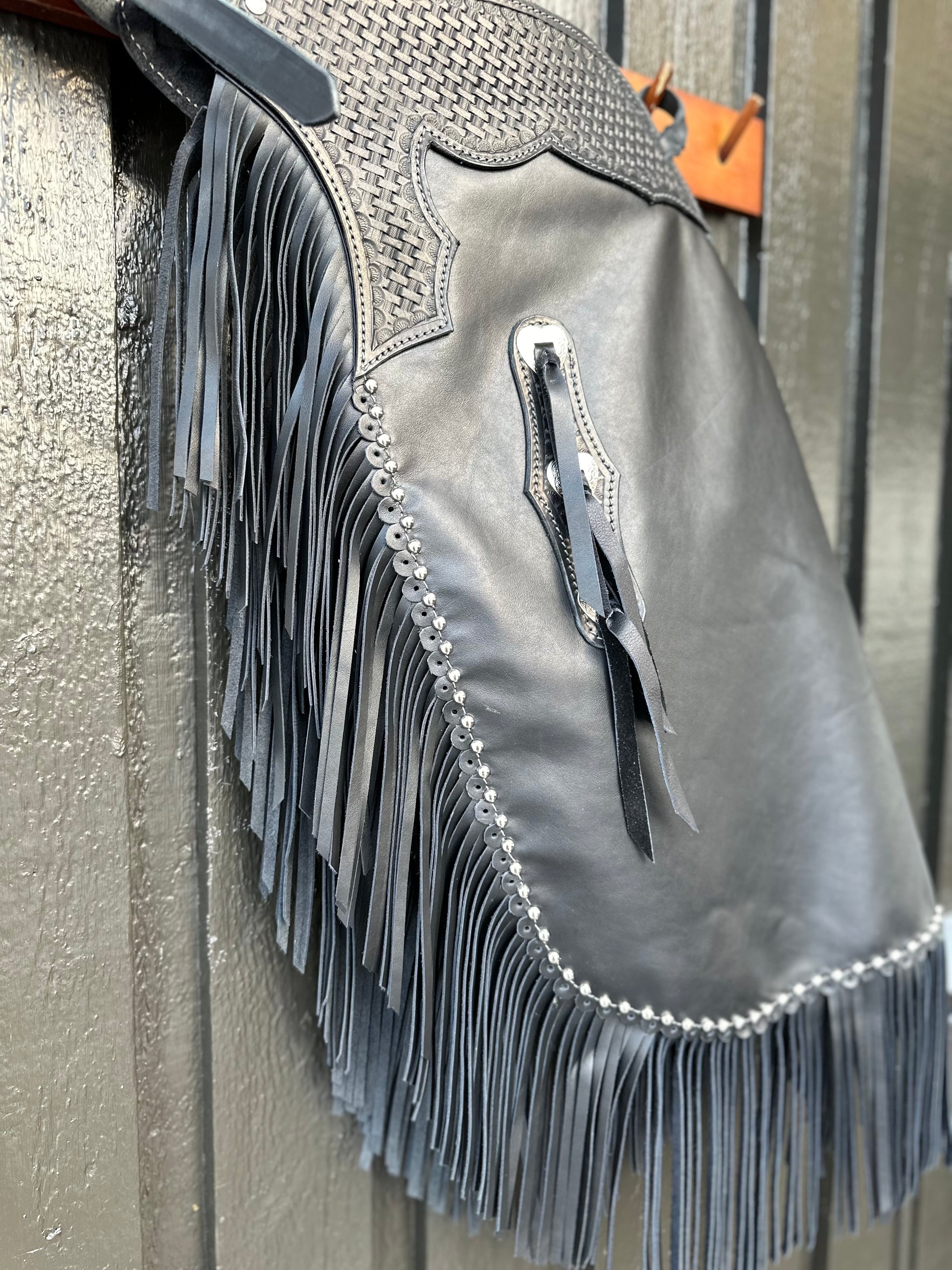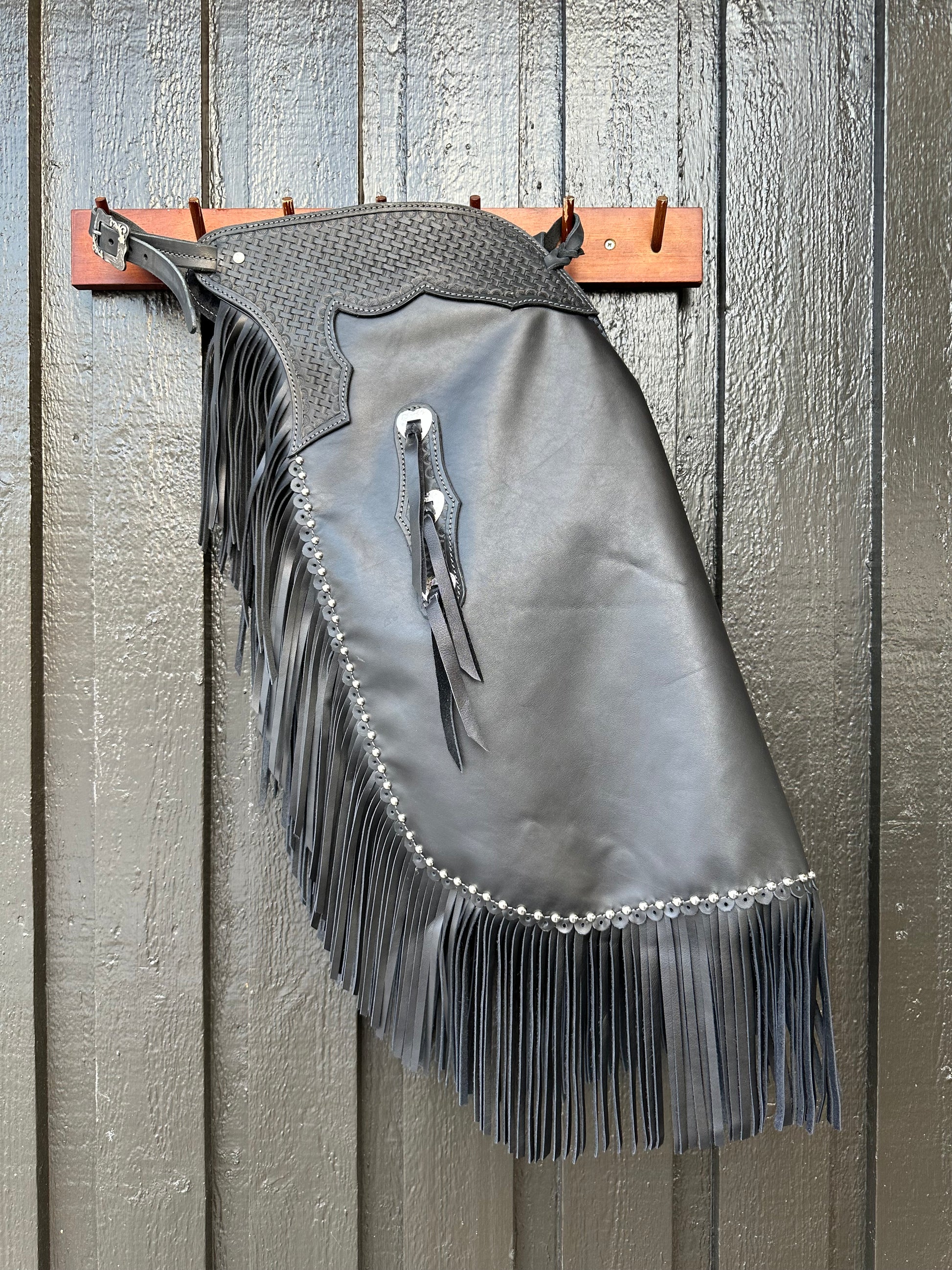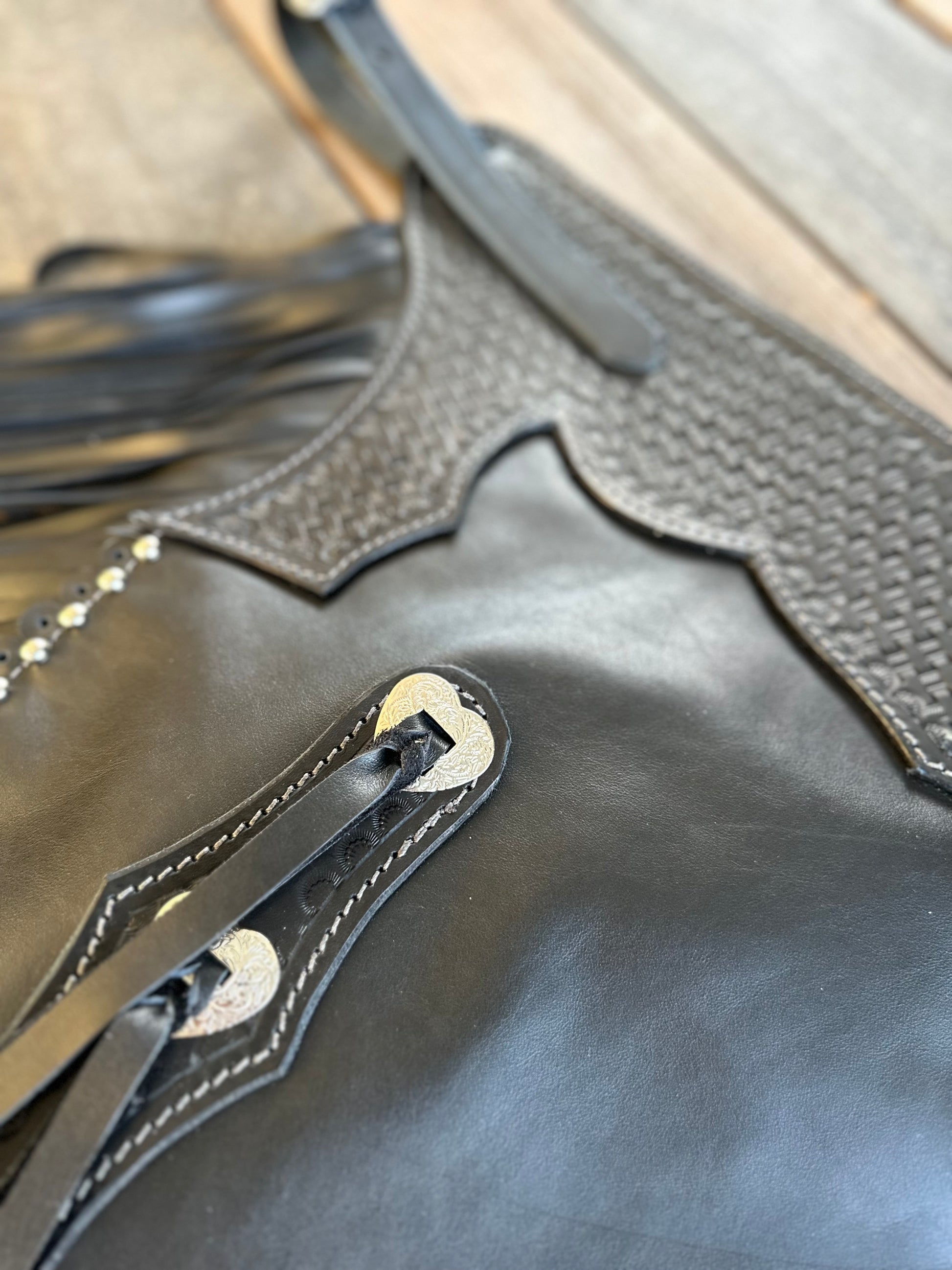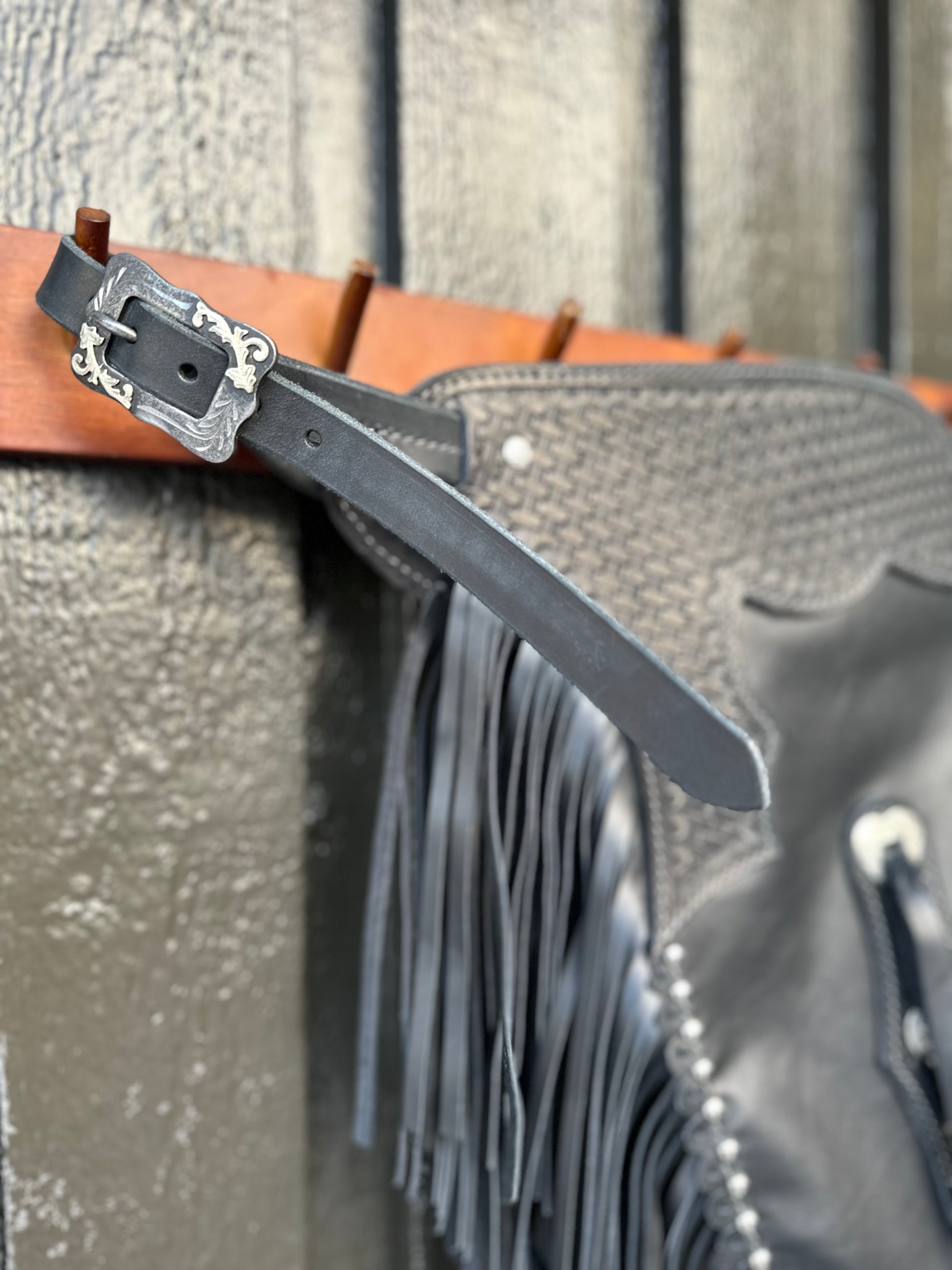 Black leather chinks with heart concho details and an antique silver buckle paired classic basket stamping on the yokes. Both back and front belt are adjustable in size.