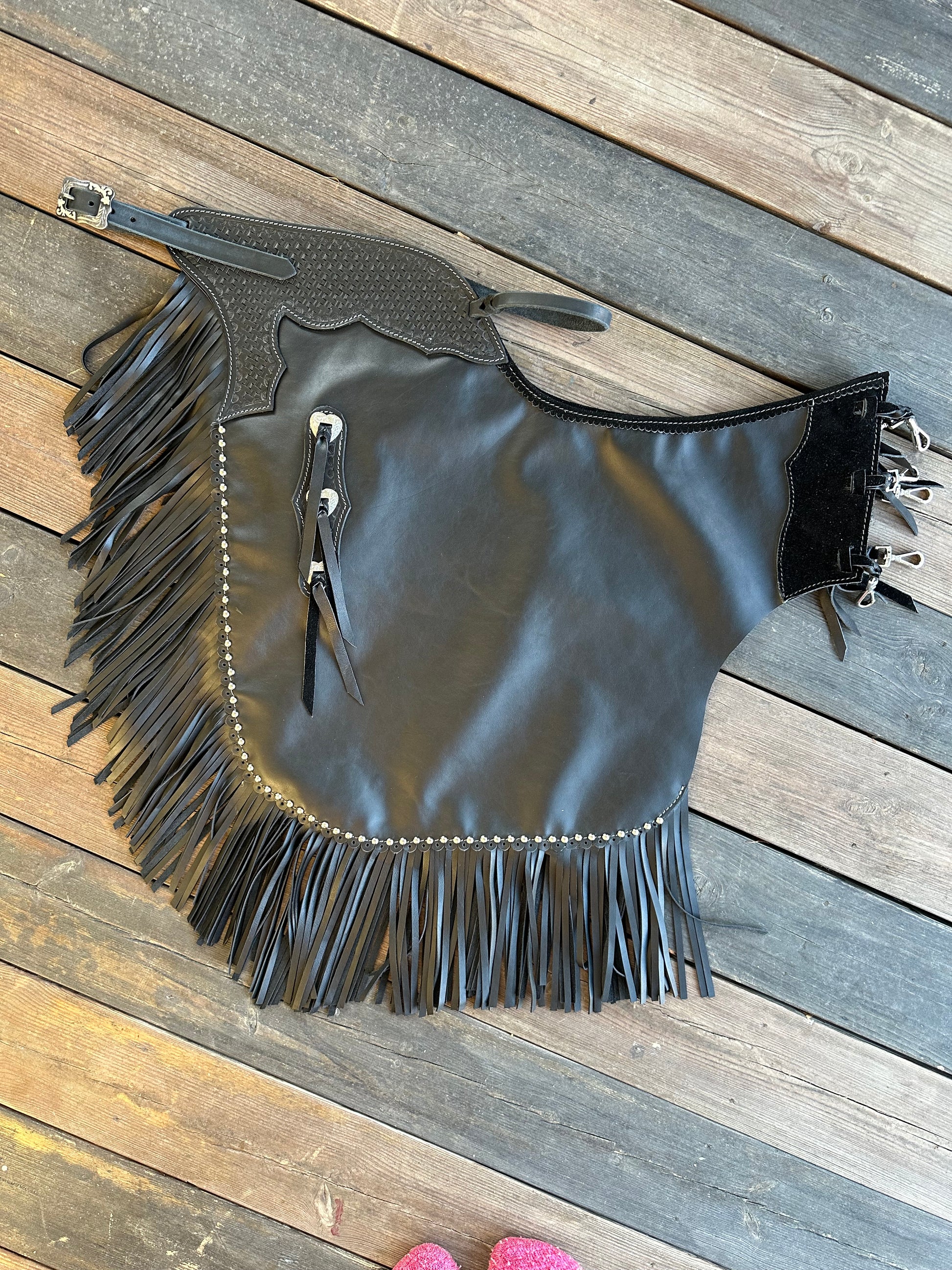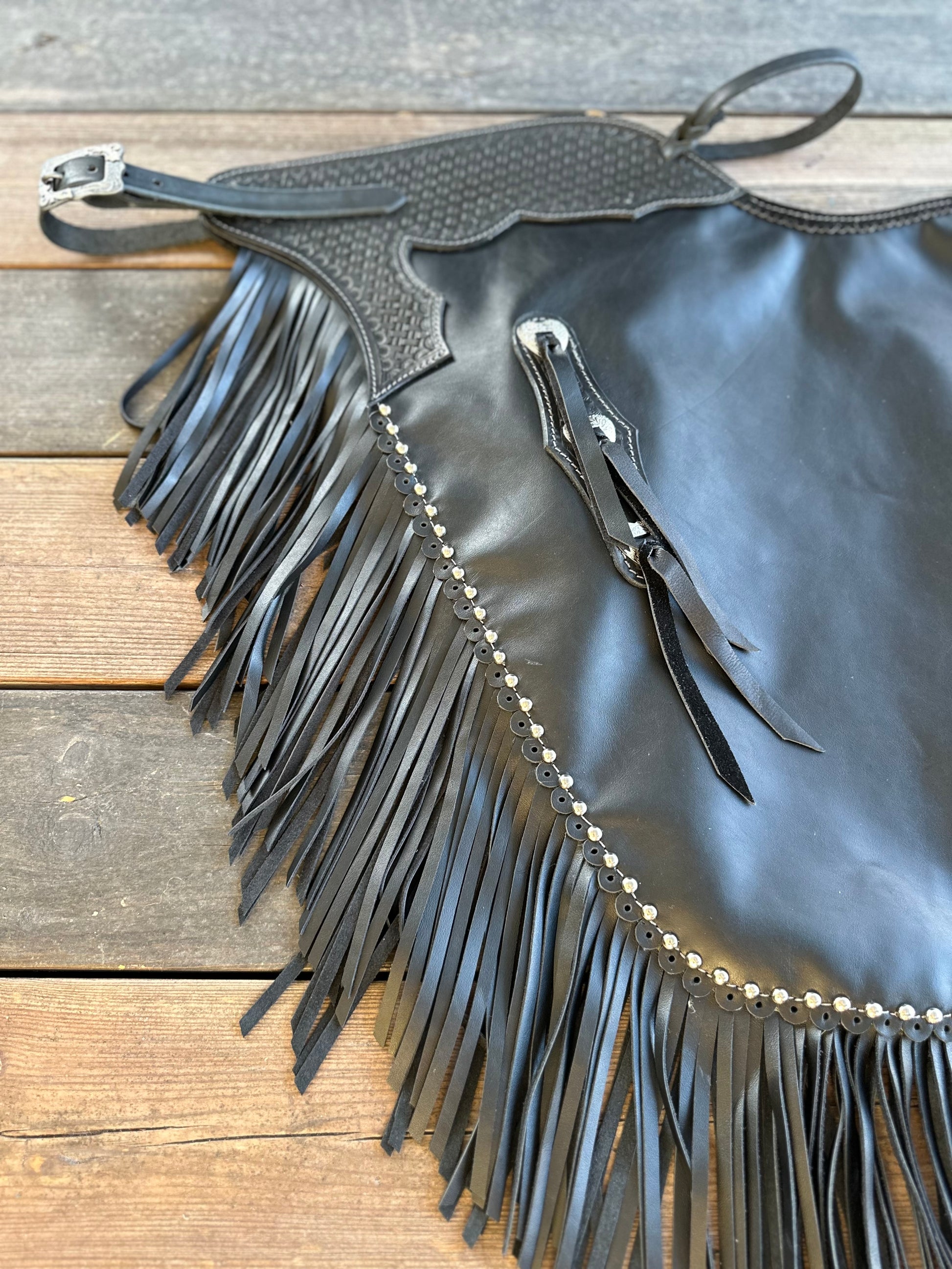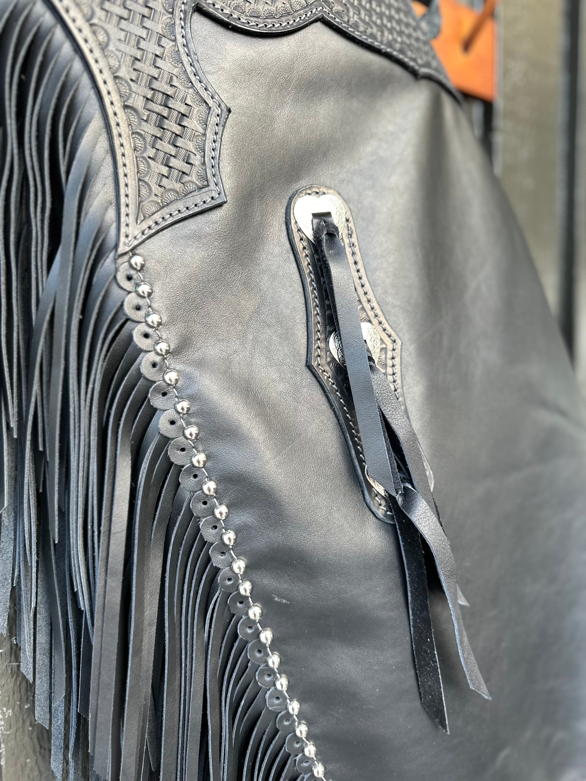 Black leather chinks with heart concho details and an antique silver buckle paired classic basket stamping on the yokes. Both back and front belt are adjustable in size.