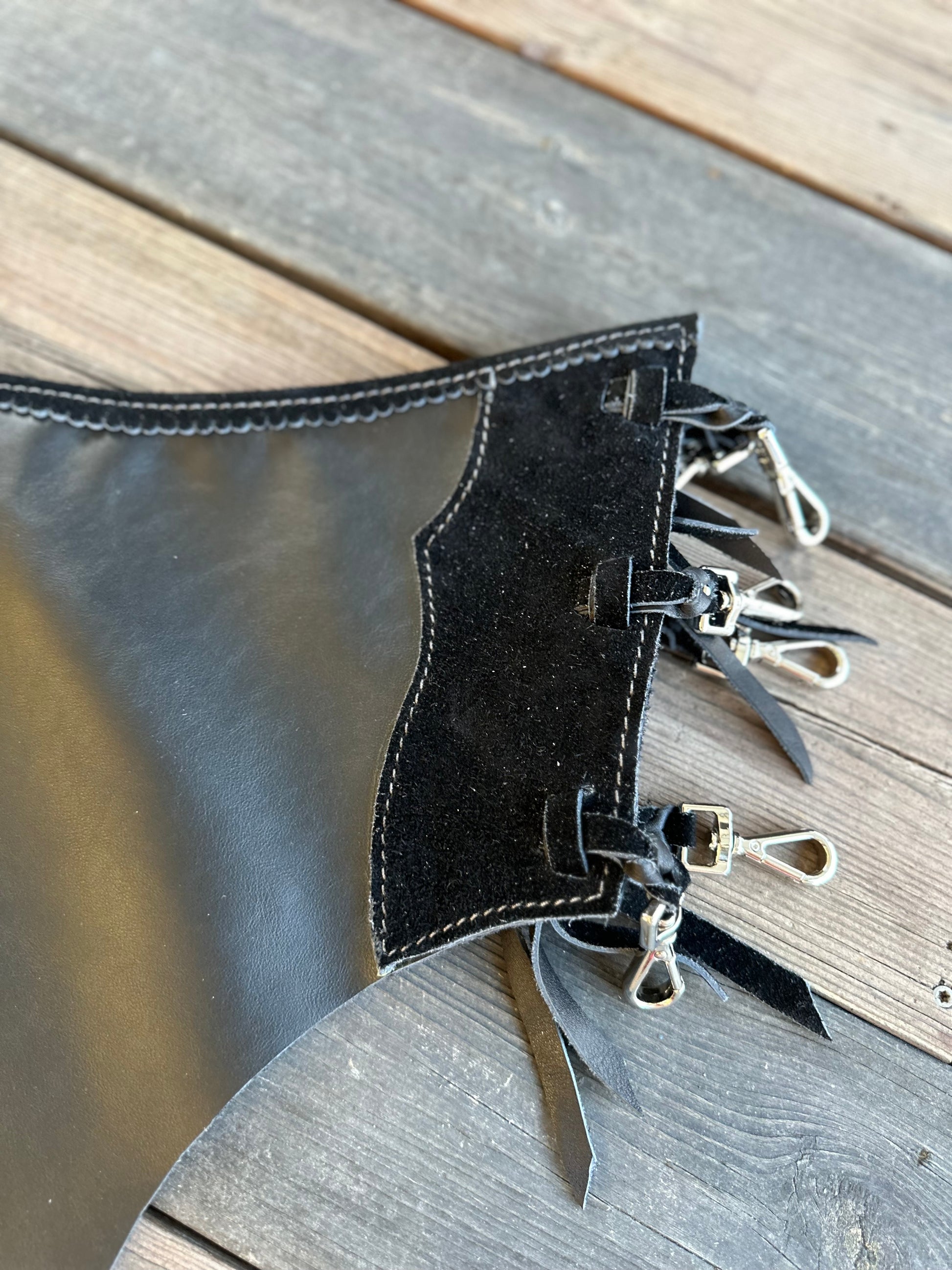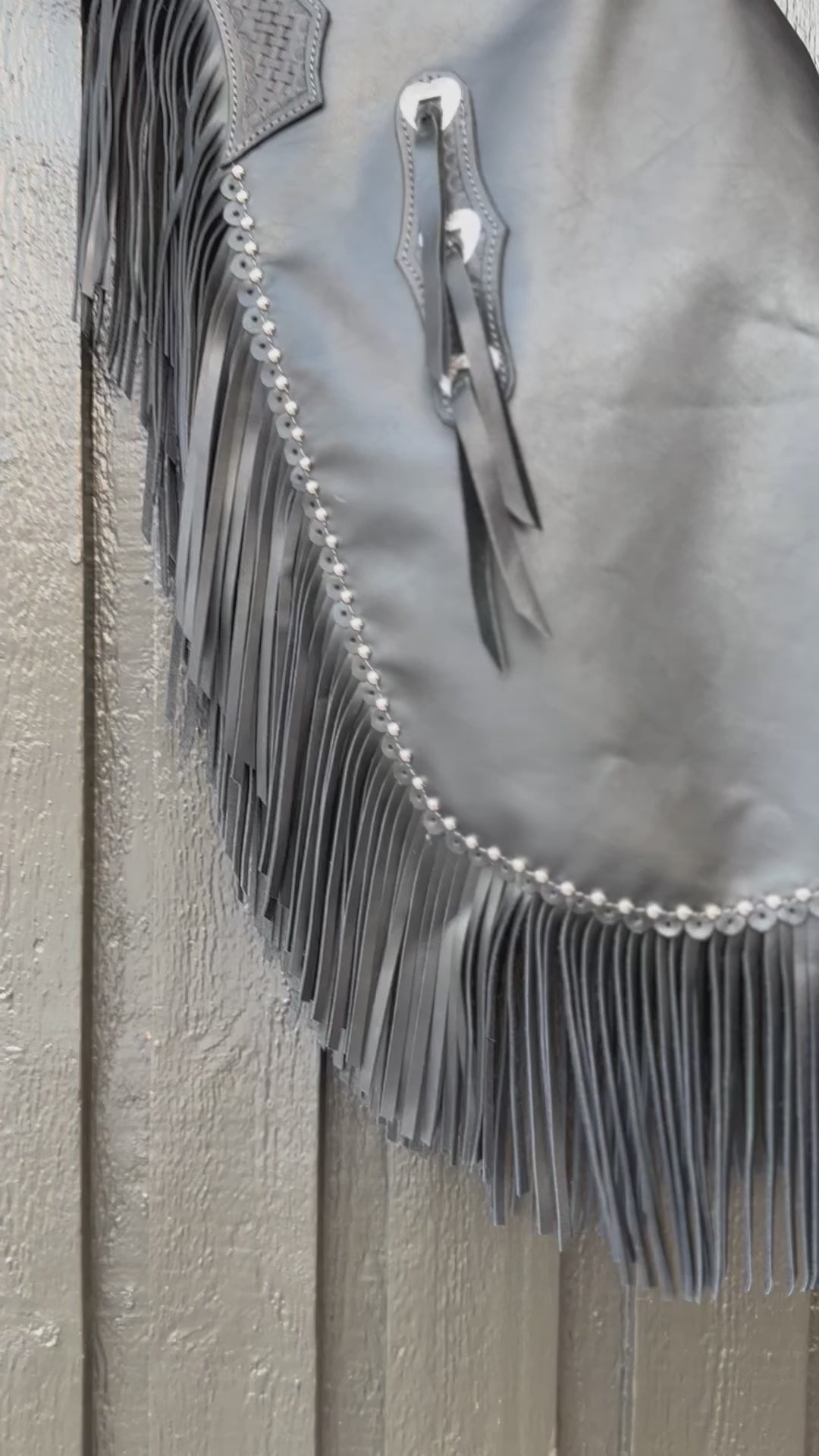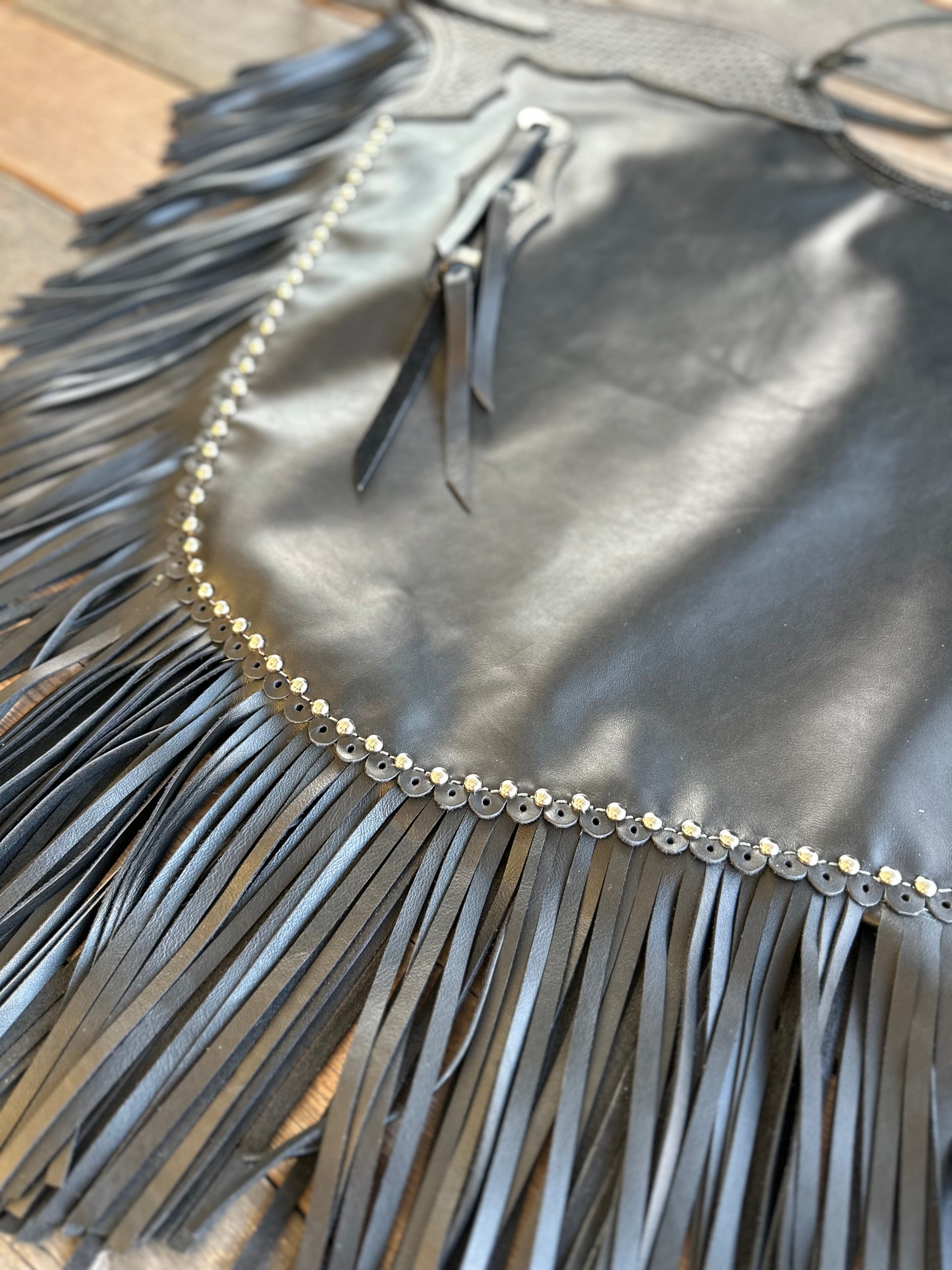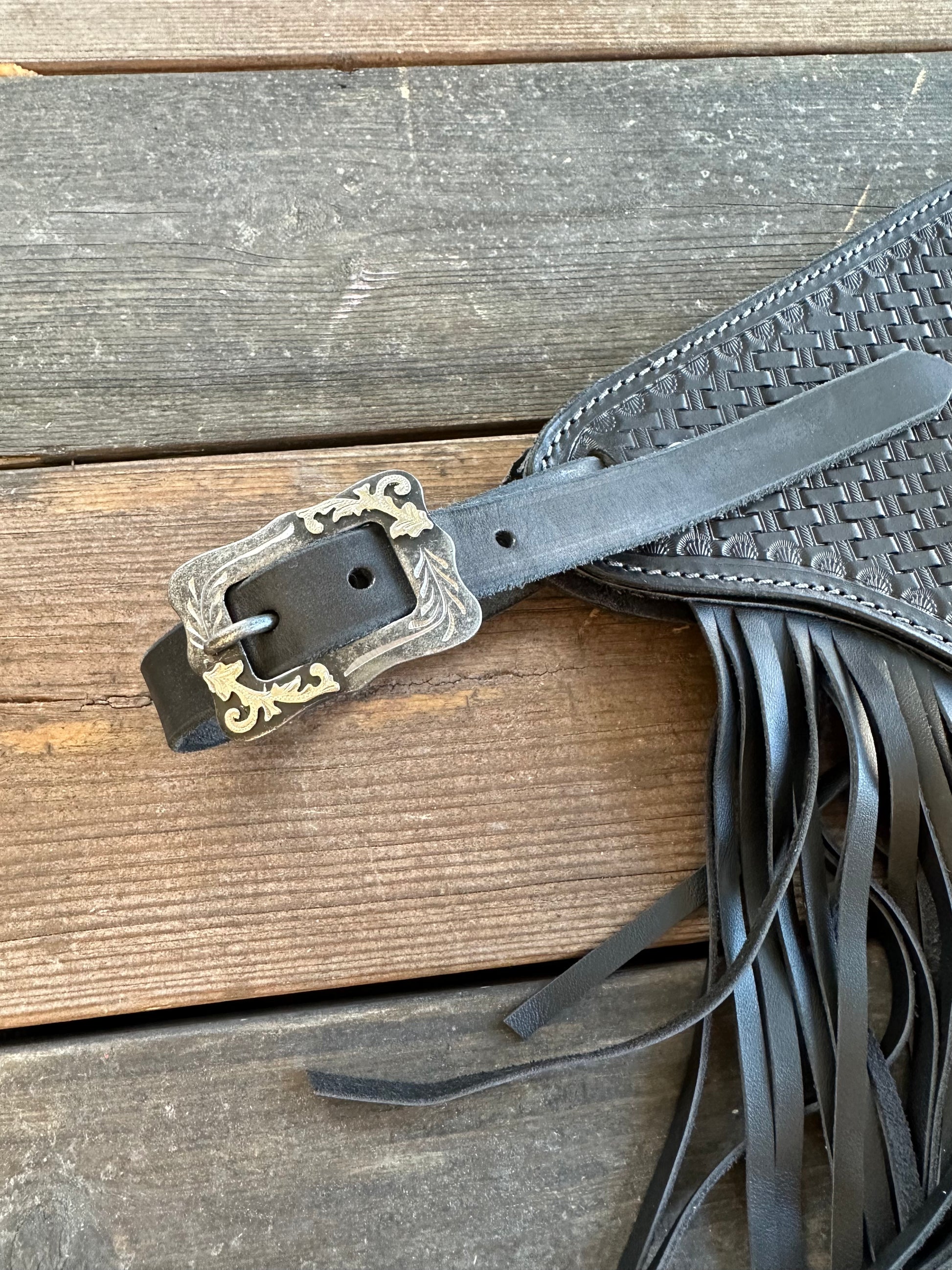 Black leather chinks with heart concho details and an antique silver buckle paired classic basket stamping on the yokes. Both back and front belt are adjustable in size.
