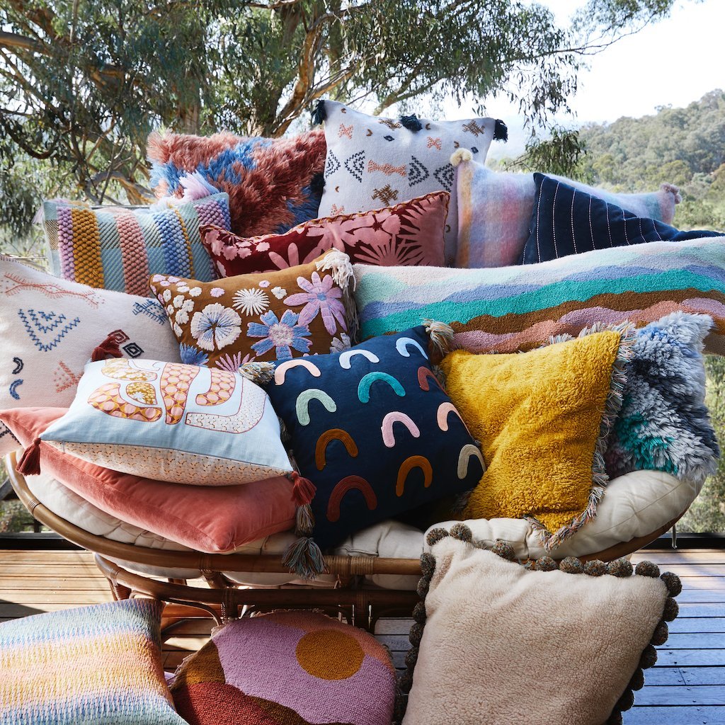 The Holly Soutache Cushion delivers eye-catching motifs, contrasting colour ways and high quality fabrics in one. A textured cotton base features an array of rainbows which have been hand embroidered by skilled artisans.