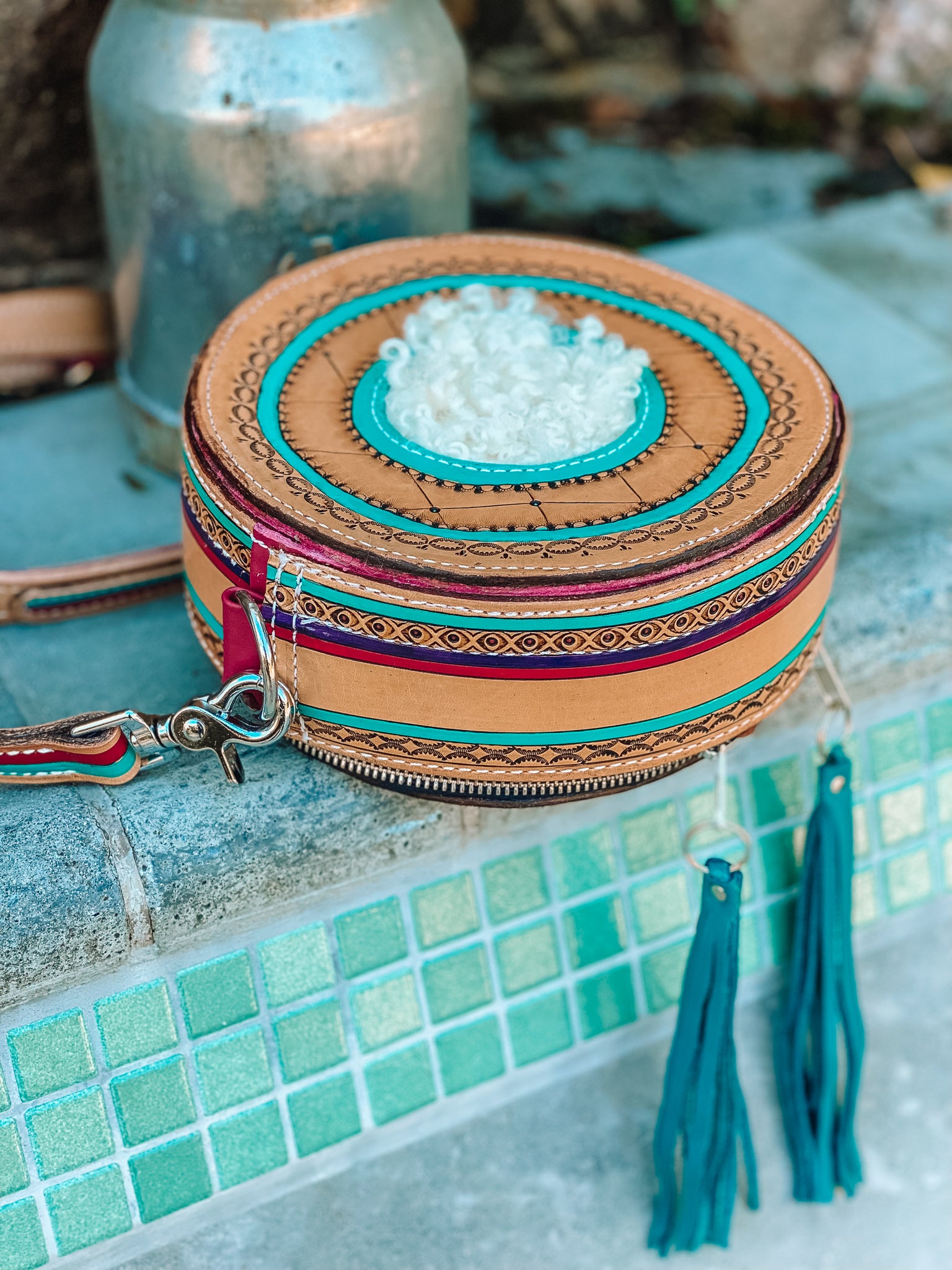Each process in making this bag, from cutting and tooling the design, to mixing colours in the paint & dye is done to bring this bag to life. This round leather bag features a double sided zip with leather tassels and simple stainless steel details on the strap. The bag itself is lined with pink leather.