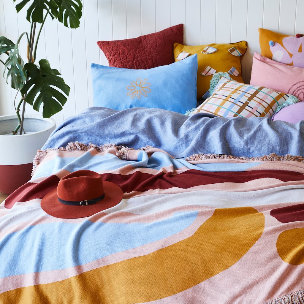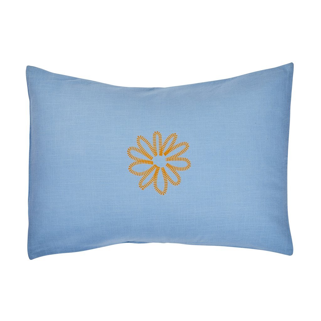 The Junipero Flora Pillowcase combines these influences to stunning but understated effect. A hand printed dashed flower in dandelion sits in the middle of this textured cornflower cotton pillowcase, which is finished with an envelope seam reverse.