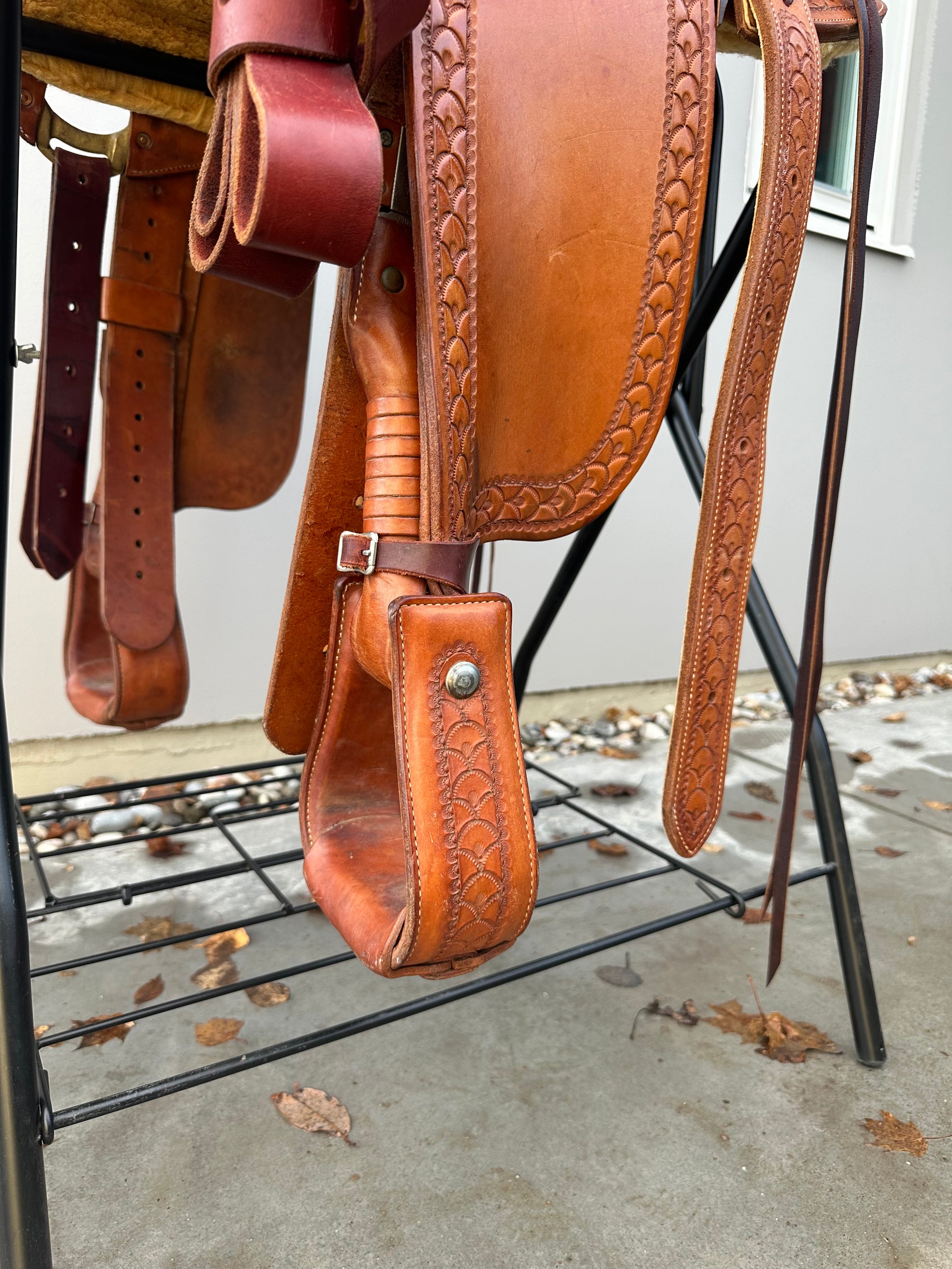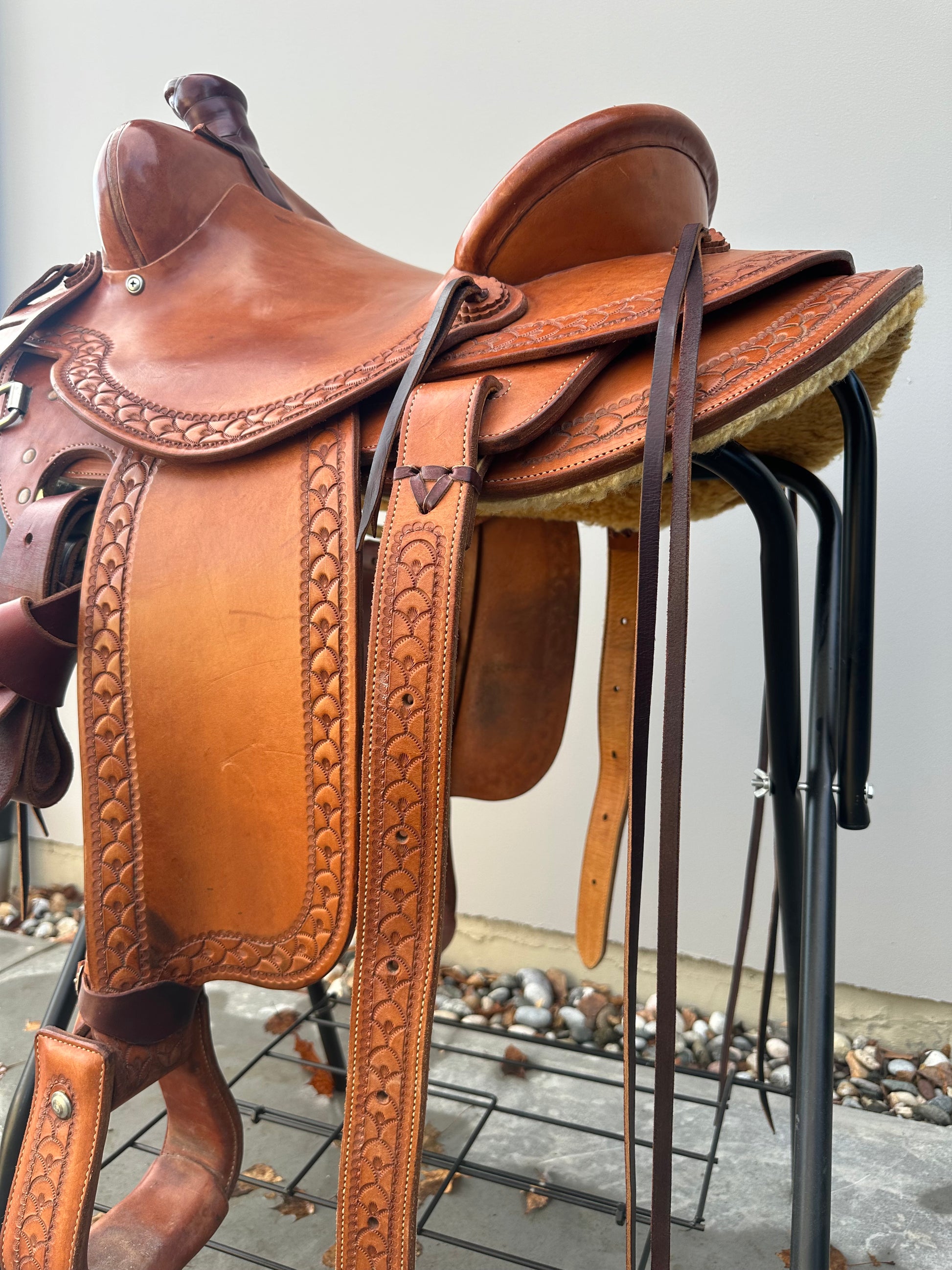 This solid working ranch saddle was custom build for an arab, and has been well taken care off. Fits the more narrow horse like arabs, warmblood trotters, or even pony because of its short length etc.