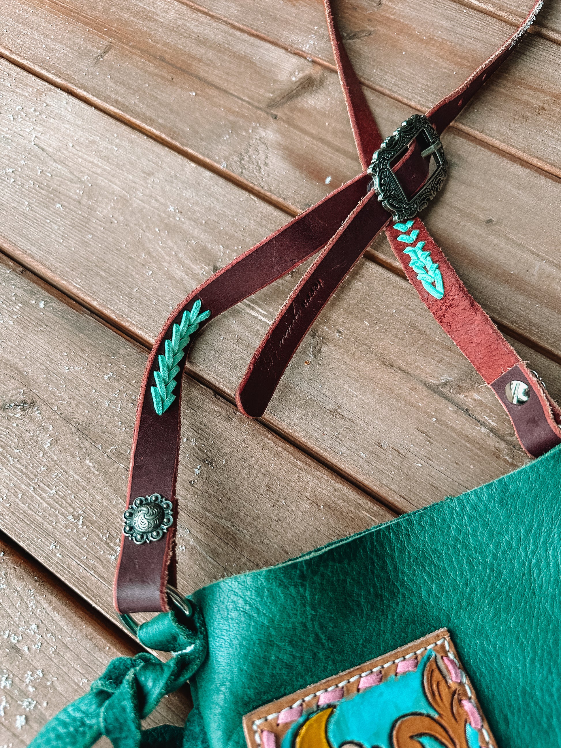 Soft leather bag in a teal coloured leather. The shoulder strap is featuring leather lace details, conchos and a decorative buckle on a Latigo strap. The bag itself has decorative stitching, fringes and a wild pony leather latch.