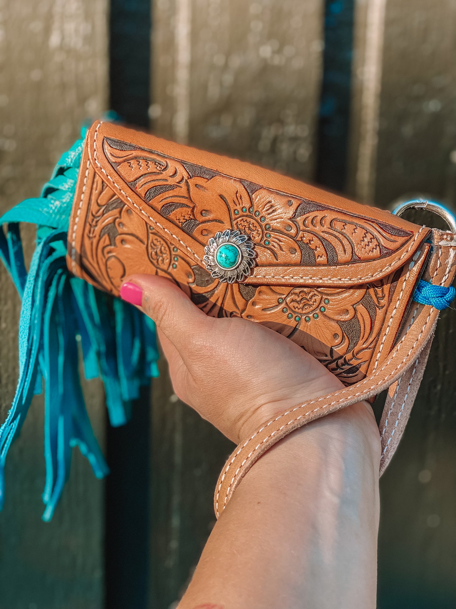 The wallet is hand cut, tooled, painted, conditioned and sealed and ready to live a long & happy life. The overall design features florals with vine details, basket weave stamping and turquoise accents.